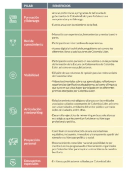 La Red Mejores Gobernantes ofrece una propuesta de valor integral, orientada a fortalecer el rol de liderazgo de sus miembros más allá de sus periodos de gobierno. A través de una combinación de beneficios tangibles, oportunidades de visibilidad, espacios de formación continua y articulación con actores clave del ecosistema de desarrollo territorial, la Red busca potenciar la trayectoria, el legado y el impacto de sus experiencias significativas. Esta propuesta de valor es también una estrategia para construir comunidad, compartir conocimiento entre pares, activar nuevos liderazgos y mantener vigente la vocación de servicio público en contextos diversos. A continuación, se describen los pilares que la sustentan.